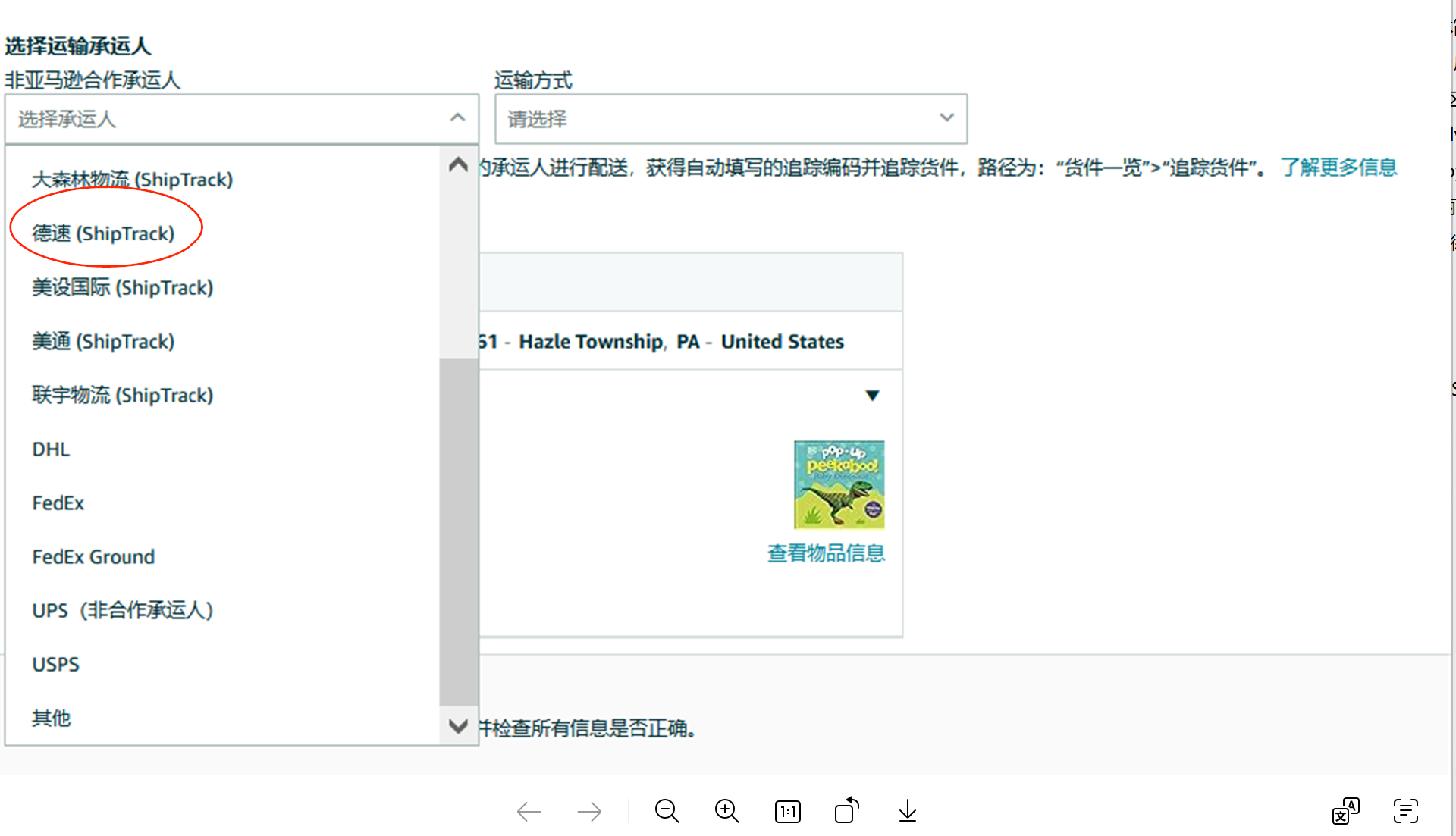 當(dāng)賣家使用非合作承運(yùn)商時(shí),可以在創(chuàng)建貨件的第二步(或創(chuàng)建 LTL貨件時(shí)的第四步)中的“選擇承運(yùn)商”下拉字段中,找到ShipTrack承運(yùn)商列表。選擇“德速電商物流”